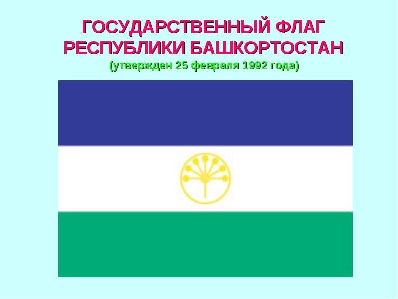 Государственный флаг Республики Башкортостан представляет собой прямоугольное полотнище с горизонтальными равновеликими по ширине полосами синего, белого и зеленого цветов (сверху вниз). В центре белой полосы флага золотистым цветом изображена эмблема – круг, внутри которого находится стилизованный цветок курая, состоящий из семи лепестков.